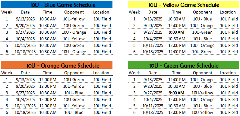 MY2025 Fall Schedule*Games are subject to change and coaches will be notified. The MOJO app will be the primary form of communication to parents and teams regarding these changes.